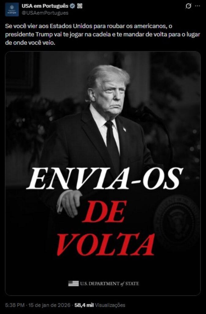 O governo dos Estados Unidos divulgou nesta quinta-feira (15/1) um aviso direto, em português, voltado a pessoas que pretendem migrar para o país. A mensagem foi publicada nas redes sociais do Departamento de Estado em seu perfil oficial em língua portuguesa e também apareceu em inglês e espanhol.
